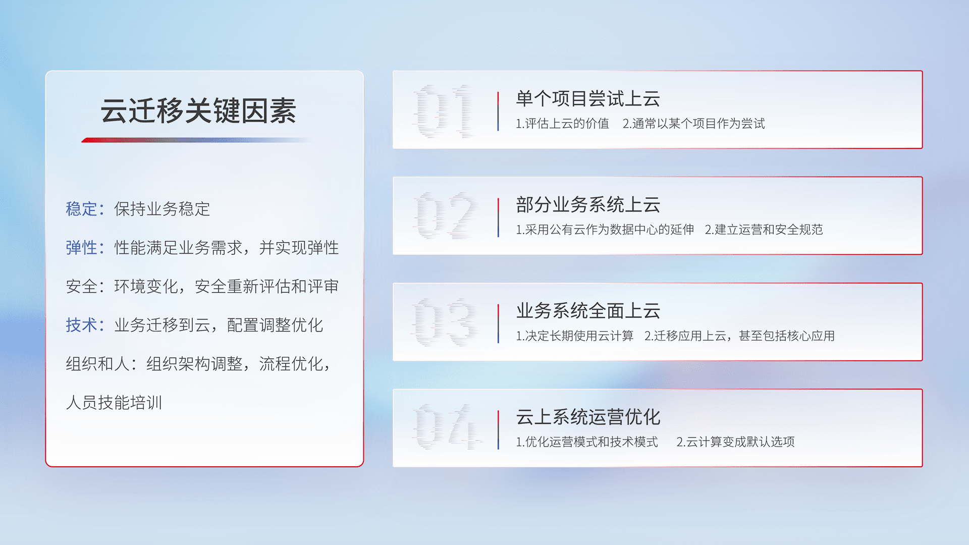 结合实际业务,,,从规划设计、、云平台选型、、云原生改造、、、、数据迁移、、、集成交付,,,,迁移全过程为客户识别最佳上云路径,,,做好风险识别管理,,,,设计网络架构、、身份权限、、、、安全审计合规、、、操作审计、、、日志审计、、、监控告警策略、、、、多站点容灾设计等,,,,对云上基础设施进行整体规划,,,,提升IT治理水平,,,以满足弹性、、、高可用、、、高性能的需求。。。。