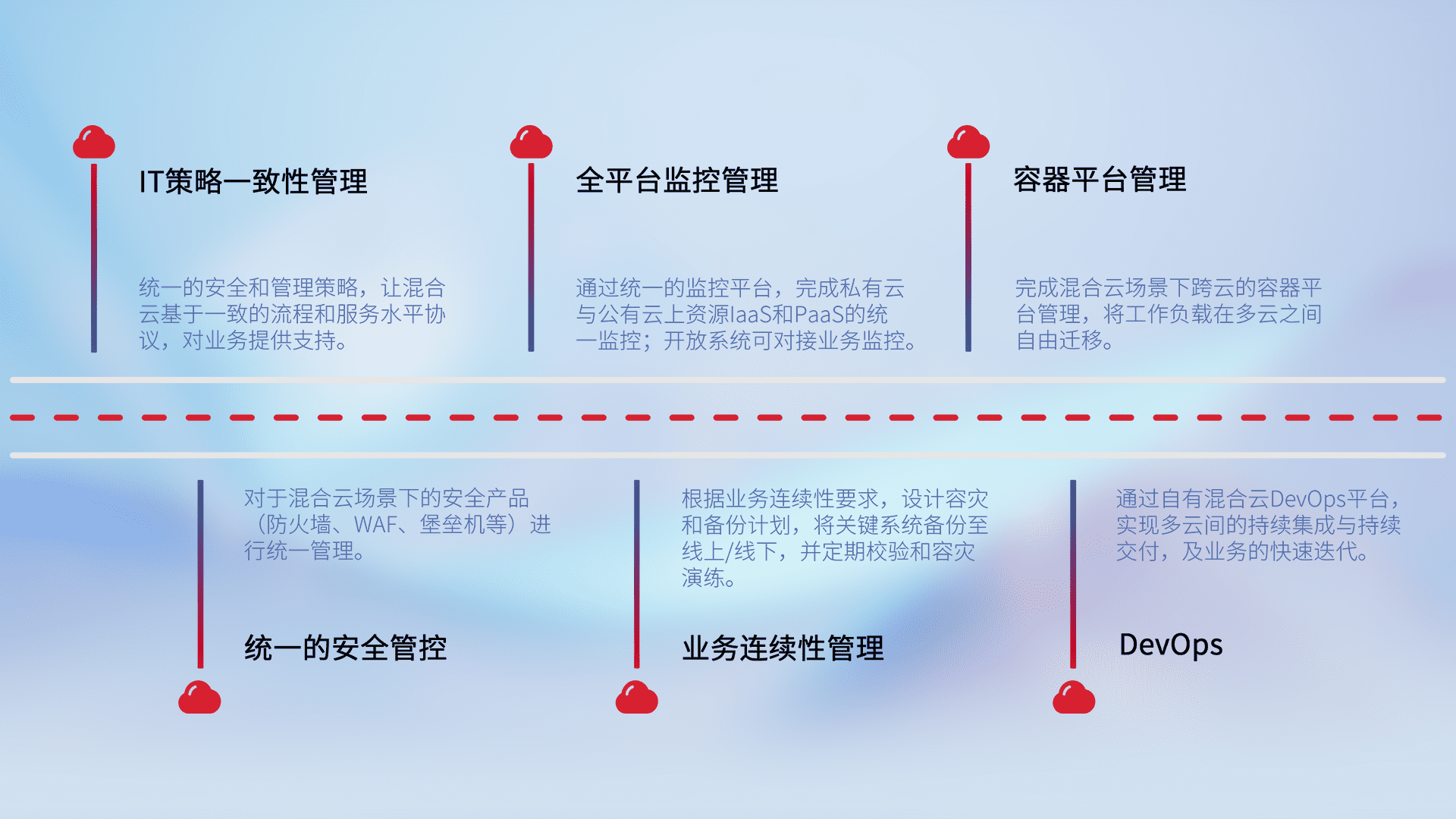 通过多云纳管,,,以统一的资源数据模型把客户的云资源进行抽象和封装,,,,进而实现对多云资源的统一操作,,,保障云资源管理的可靠性、、、稳定性与可用性。。。量身定制化运维内容,,配置、、、、开发运维、、补丁管理、、、、备份、、、监控、、、认证和访问管理、、审计和日常巡检等,,,保障在用云过程中的可靠度,,,,稳定度以及高可用率。。