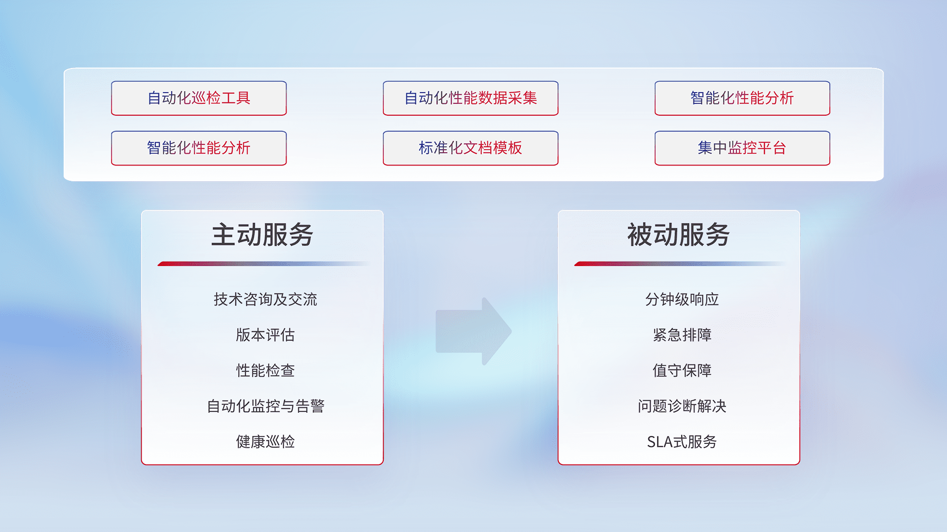 智能化工具和标准化文档,,,,保障服务质量,,,,提供主动服务(包含技术咨询、、版本评估、、、、性能检查、、自动化监控与告警、、、、健康巡检)和被动服务包含(分钟级响应、、紧急排障、、、值守保障、、问题诊断解决、、SLA服务)。。
